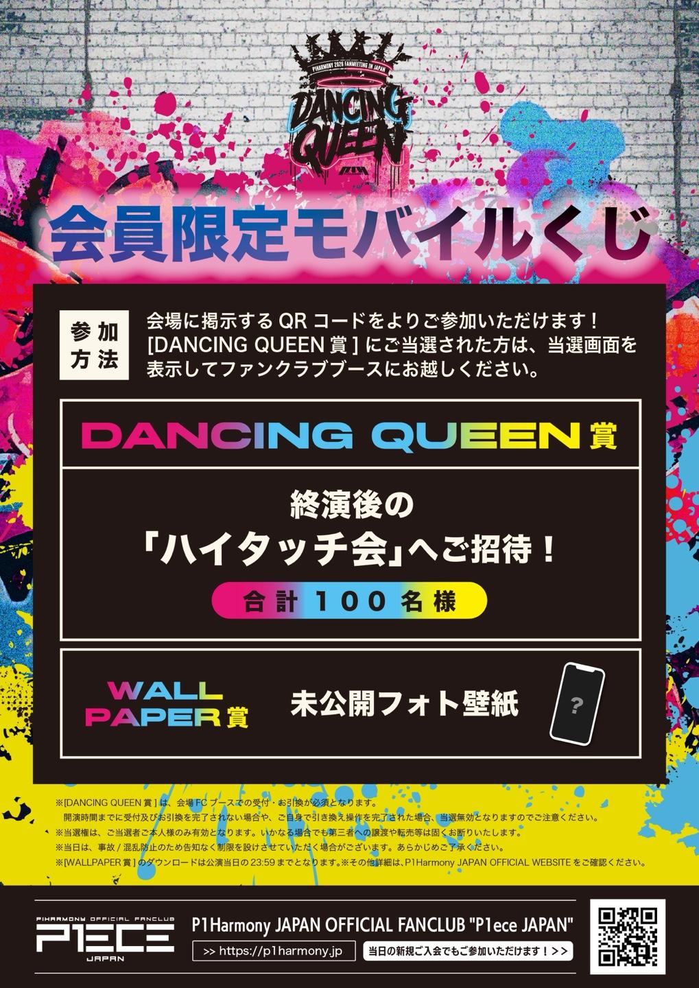 ・[DANCING QUEEN賞]は、会場FCブースでのお引き換えが必須となります。ご当選された方は画面操作を行わずに、当選画面に記載の開演時間までにFCブースまでお越しください。